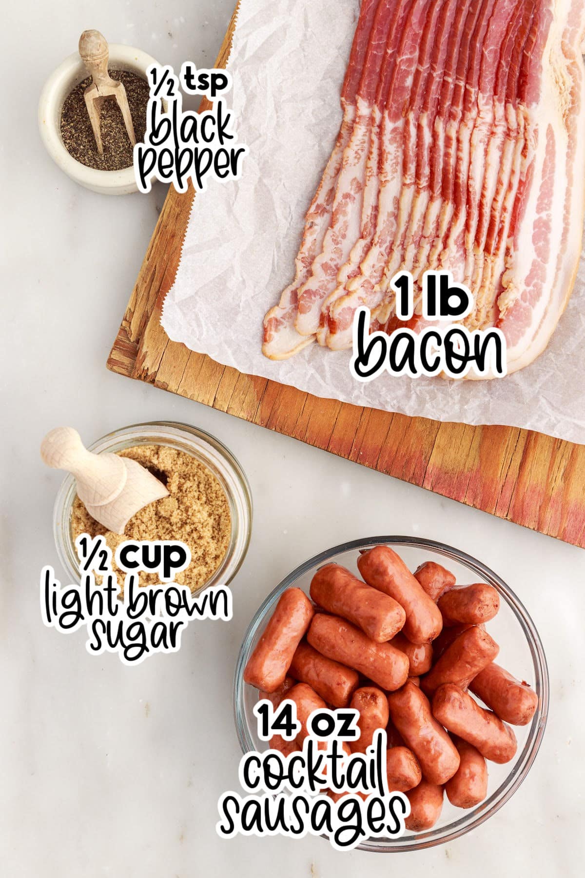 - Wrap each little smokie with a piece of bacon, overlapping the ends., Place seam side down and tuck into glass 8×8 baking dish. You want the wrapped sausages to sit snug up against each other – if there is space between the pieces, the bacon will come unwrapped. If using a larger baking dish, you can secure each piece of bacon around the sausage with a toothpick.