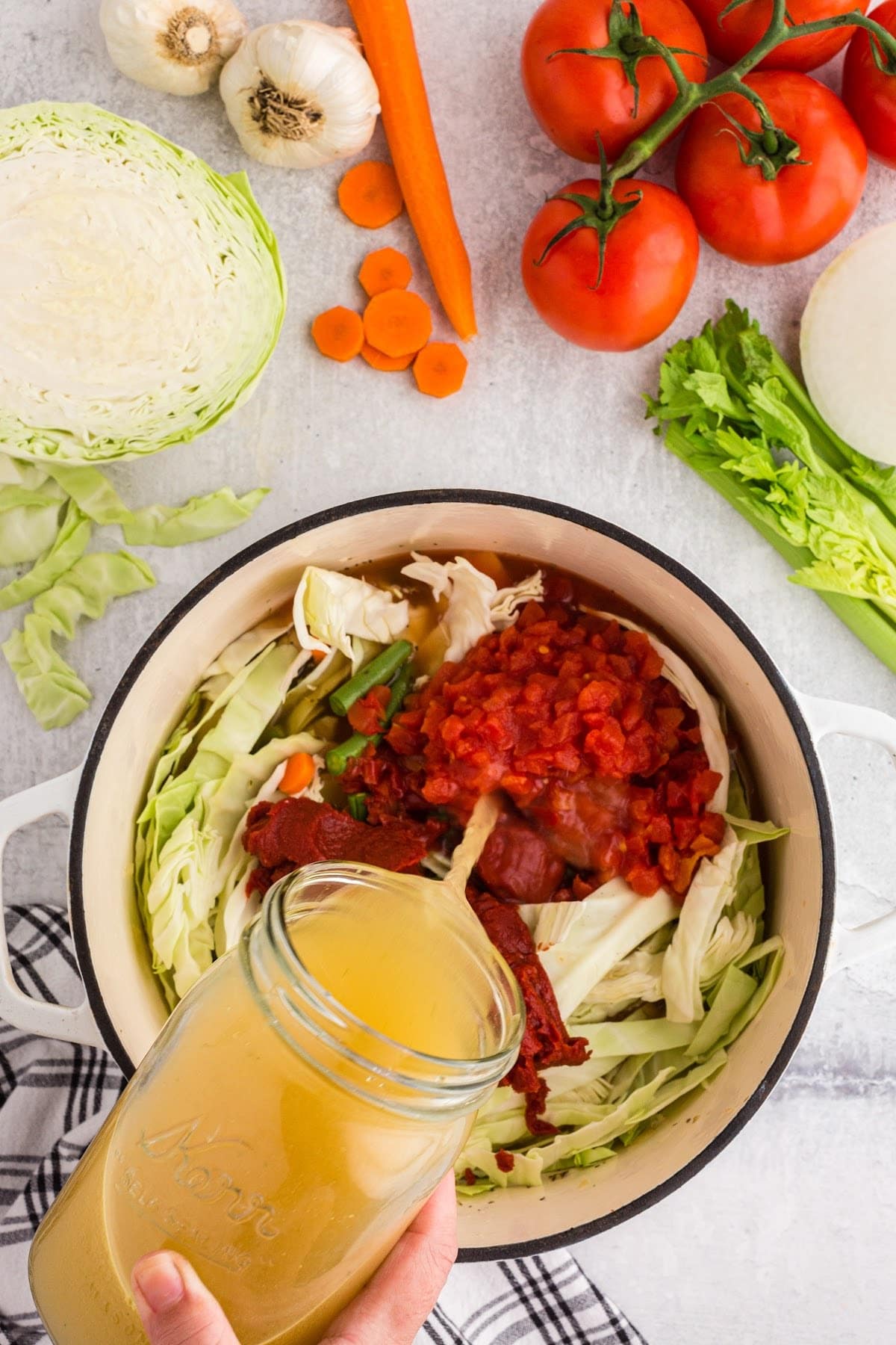 - Add any kind of vegetables to this cabbage soup. You could bulk up your soup with carb-rich vegetables such as turnips and potatoes, or keep your soup low-carb by using less starchy options. Just keep in mind that high-starch veggies do take longer to cook which you’ll need to factor into your overall cooking time.