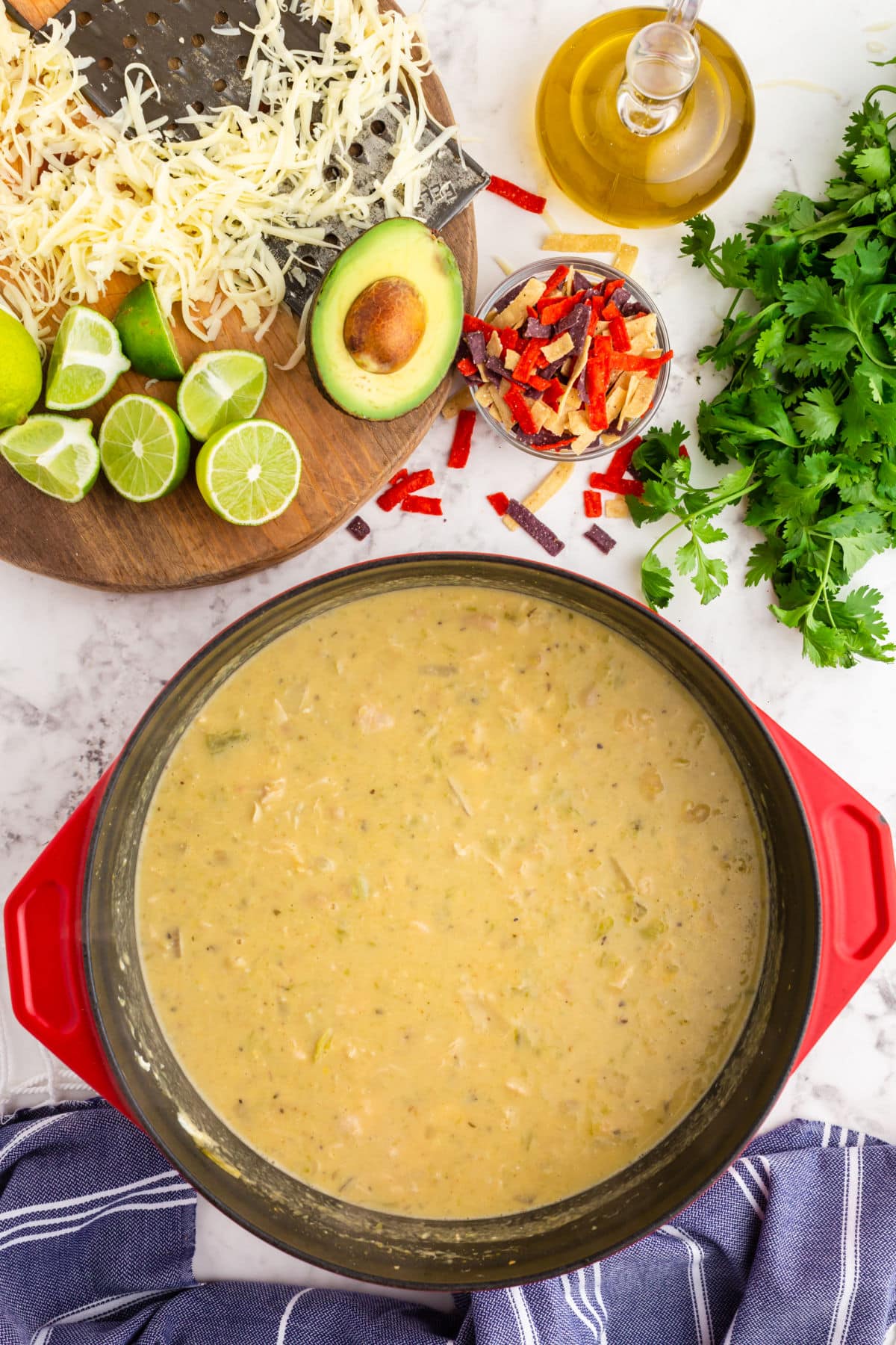 GARNISH/SLICE/SERVE: Serve this big pot of Green Chicken Chili soup with all your favorite toppings on top! Squeeze fresh lime wedges on top and serve with warm corn tortillas on the side.